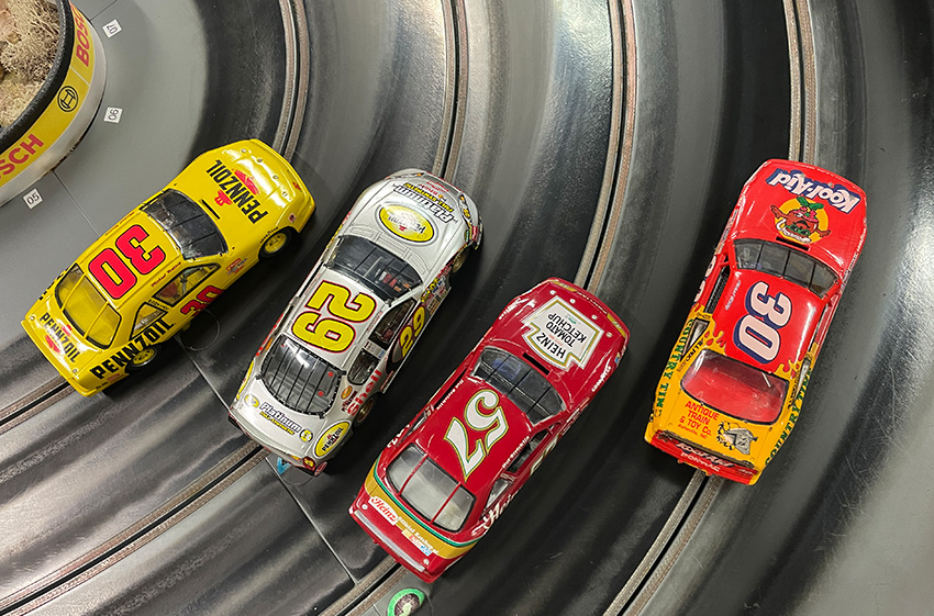 Die vier bunten Boliden aus dem Fundus von Ralf starteten zu einem 160 Runden Rennen.
